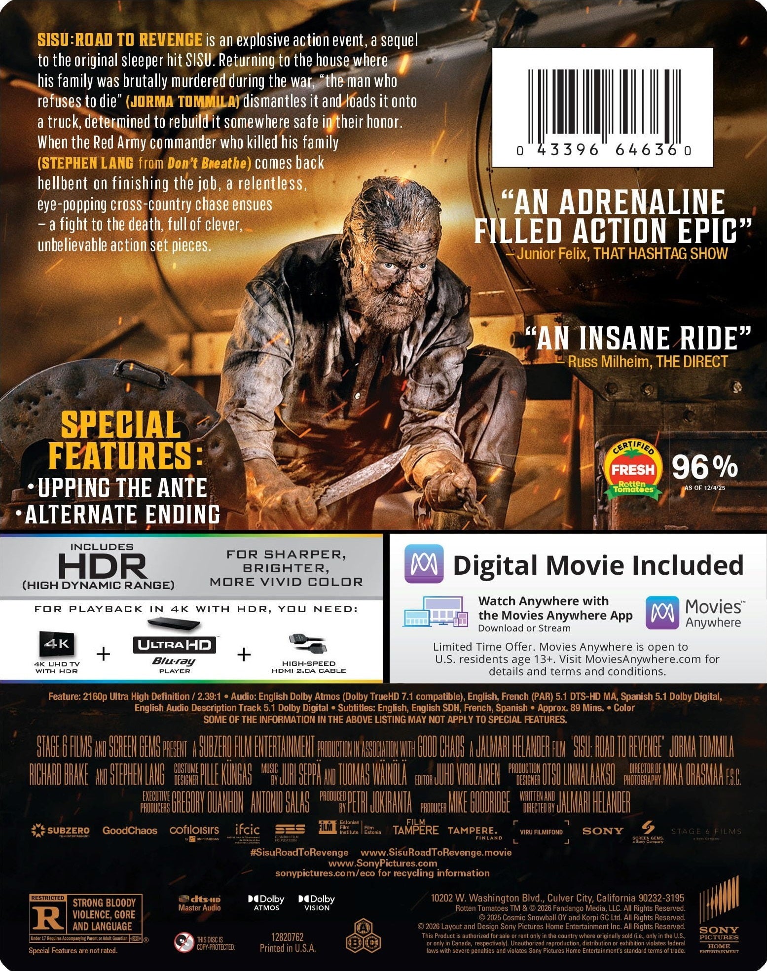 SISU: ROAD TO REVENGE is an explosive action event, a sequel to the original sleeper hit SISU. Returning to the house where his family was brutally murdered during the war, "the man who refuses to die" (JORMA TOMMILA) dismantles it and loads it onto a truck, determined to rebuild it somewhere safe in their honor. When the Red Army commander who killed his family (STEPHEN LANG from Don't Breathe) comes back hellbent on finishing the job, a relentless, eye-popping cross-country chase ensues — a fight to the death, full of clever, unbelievable action set pieces.